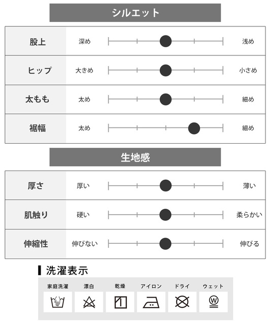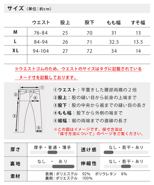 | サイズ | ウエスト | 股上 | 股下 | もも幅 | 裾幅 |