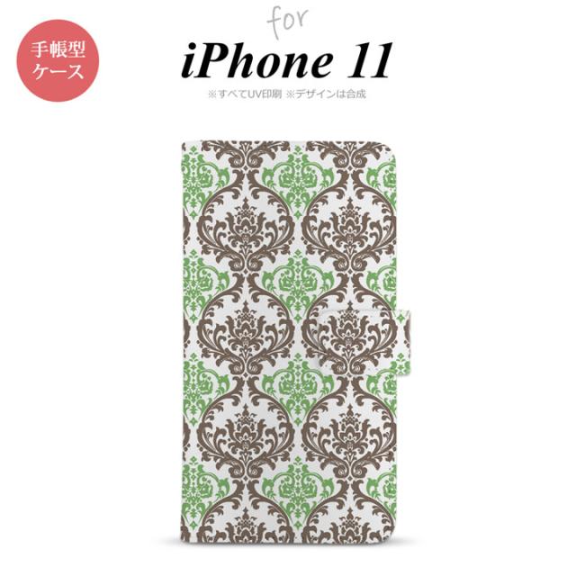 iPhone11 iPhone11 手帳型スマホケース カバー ダマスク クリア 茶 緑