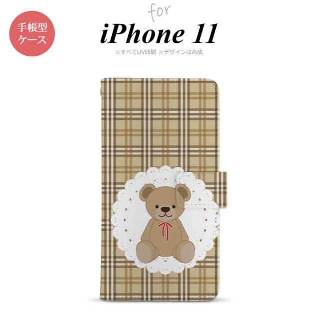 iPhone11 iPhone11 手帳型スマホケース カバー くま チェック レース 茶