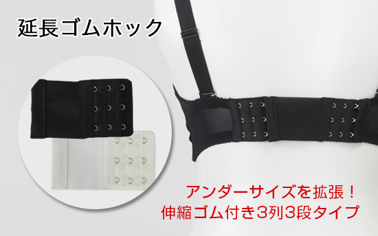 ブラジャーの後ろホックに引っ掛けるだけで、簡単にアンダーサイズを拡張できる「延長ゴムホック」