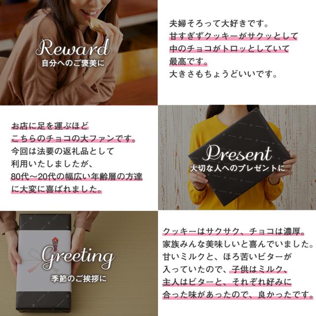 パリッとしたコーティングチョコレートと サクサク食感がたまらないバタークッキーが 分厚いガナッシュを包み込みます。熟練のショコラティエが試行錯誤を重ねて辿り着いた 香り、味、食感のハーモニーは 他のチョコレート菓子にはない極上の時間を演出します。