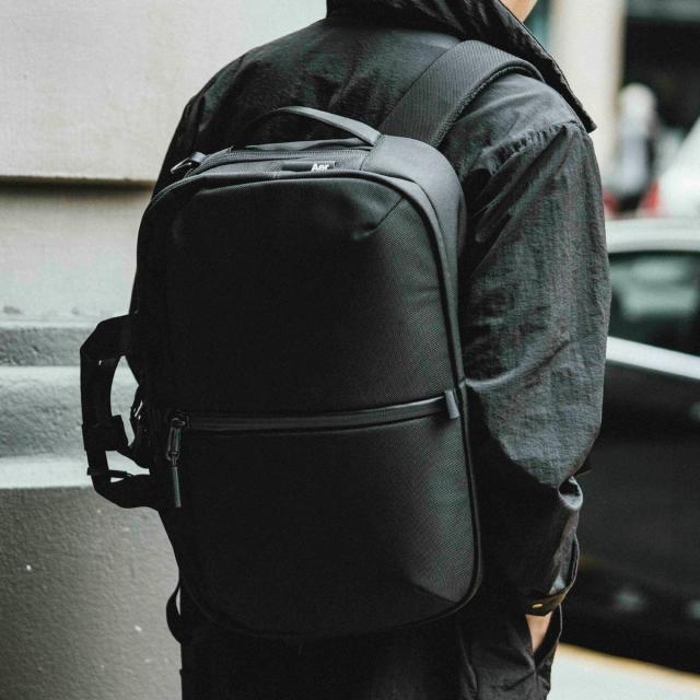 側面に拡張可能なウォーターボトルポケットなども採用した、さまざまなビジネススタイルに対応する最大容量約17.5Lのテック系バッグです。