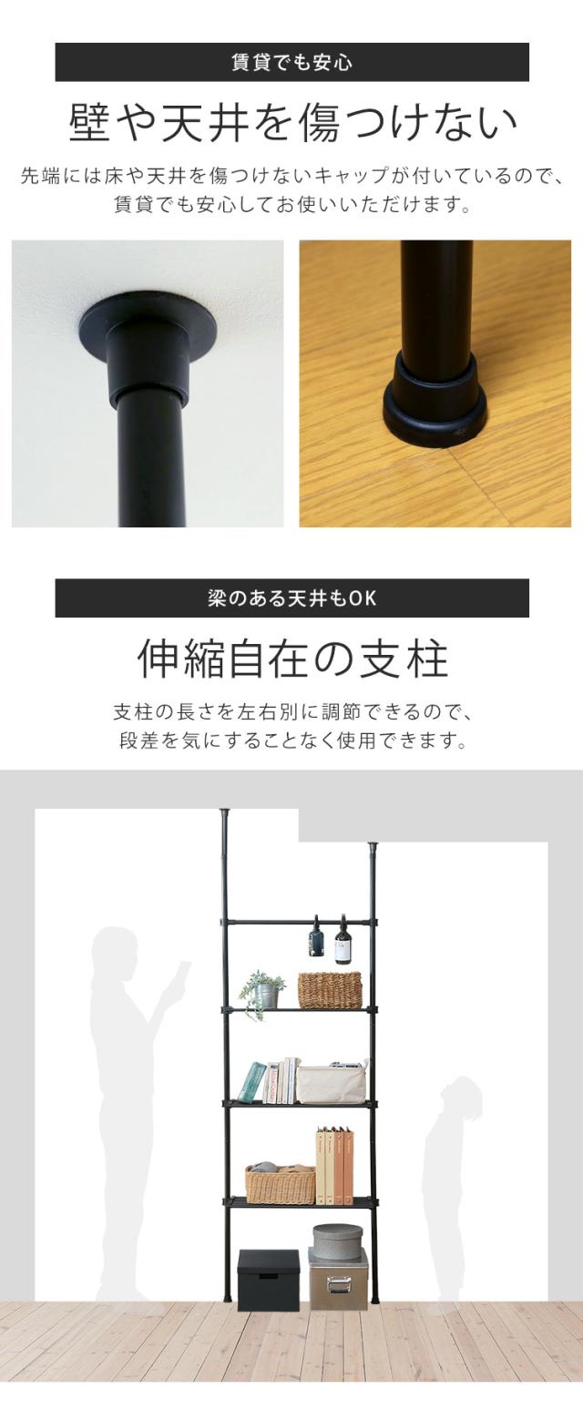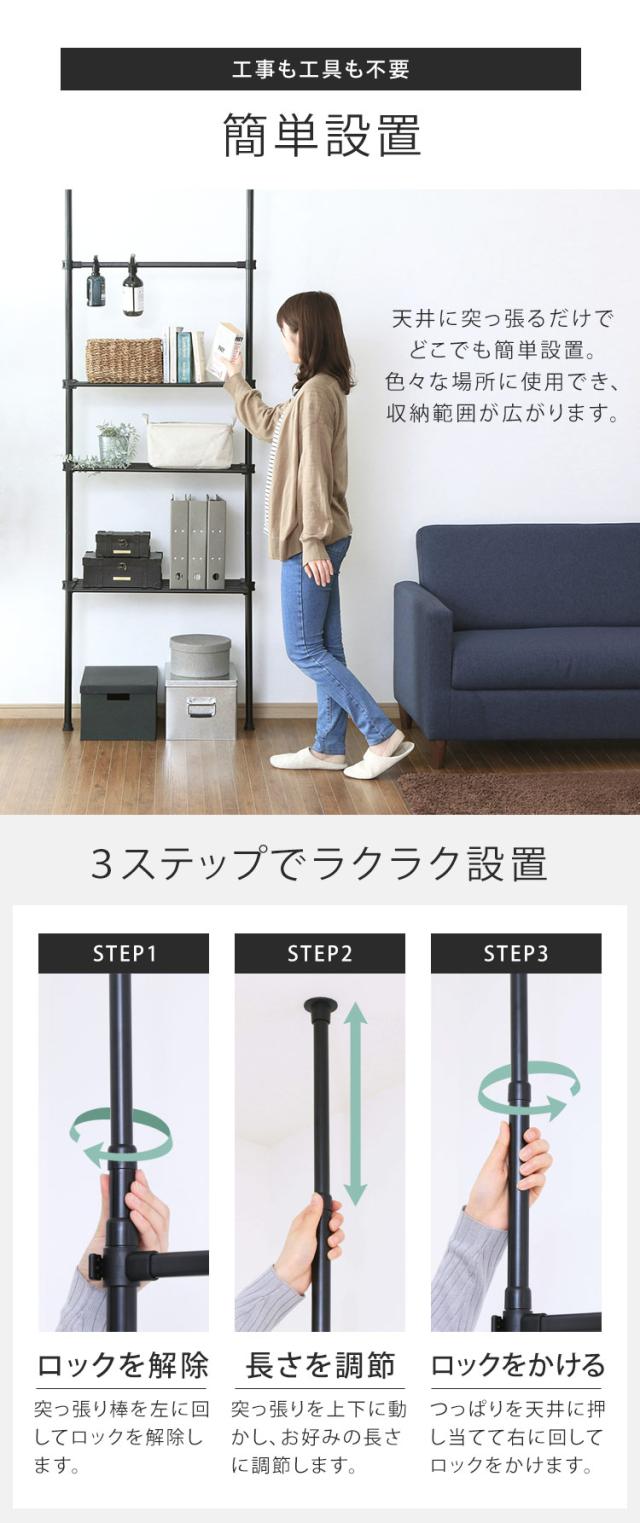 - 狭いところでは組み立てずらいです。棚の高さが自由に変えられるので、利点なのですが、平均にバランスをとることが大変なので2人居ると設置しやすいです。高さの違う天井でも設置できます。