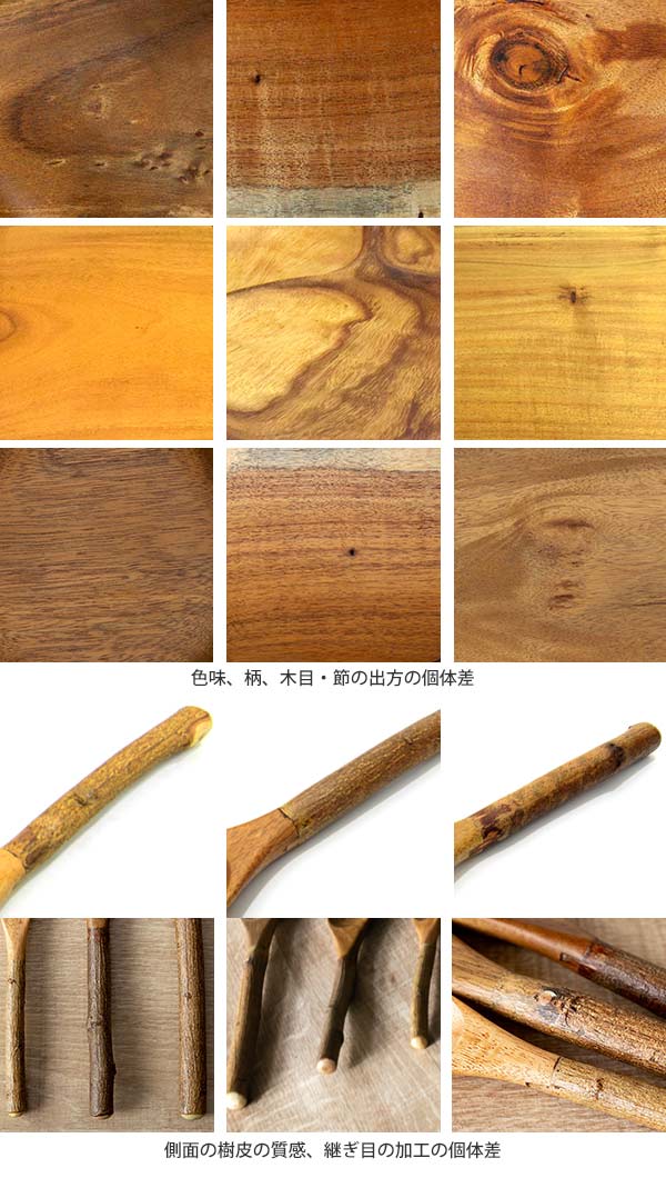 天然木を使用しているため、色味や柄、木目の出方、形状、大きさ、重量に個体差があります。