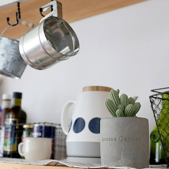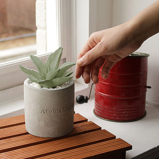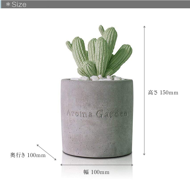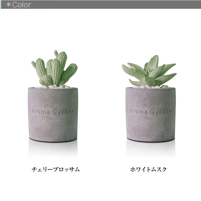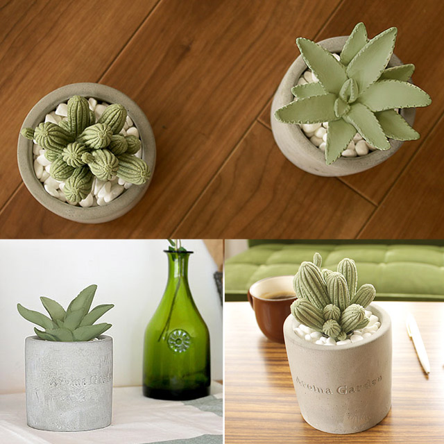 無機質なセメントのカップに入った、まるで本物のようなかわいい2種類のサボテンからは、それぞれ華やかないい香りが。