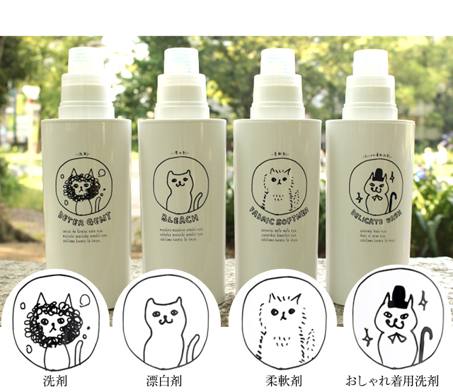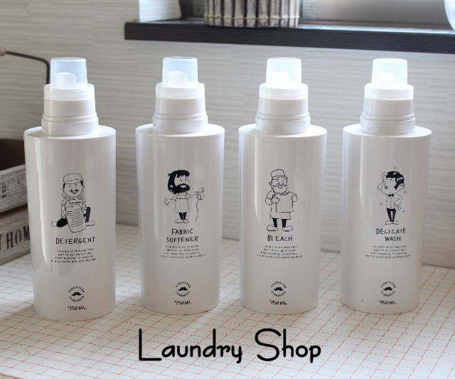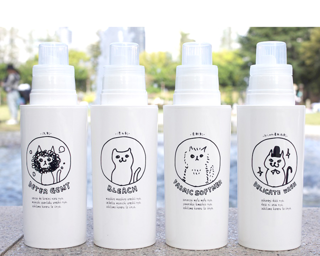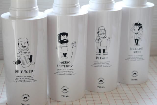 洗剤や柔軟剤、漂白剤やおしゃれ着用洗剤など、可愛いネコやひげおじさん達のイラストが描かれた詰替用ボトルで生活感をなくしおしゃれなウォッシュルームへ
