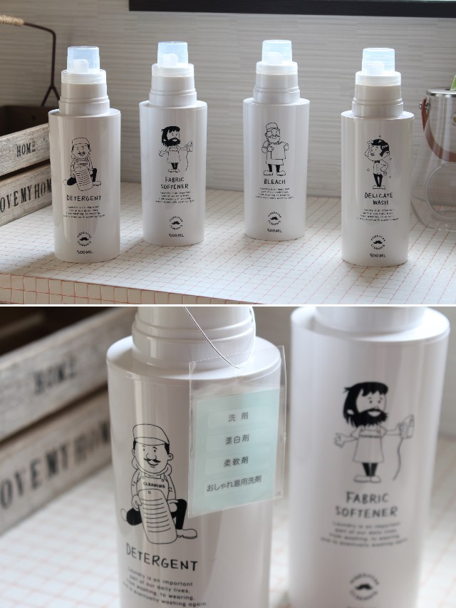 洗剤や柔軟剤、漂白剤やおしゃれ着用洗剤など、おしゃれな詰替用ボトルで生活感をなくしおしゃれなウォッシュルームへ
