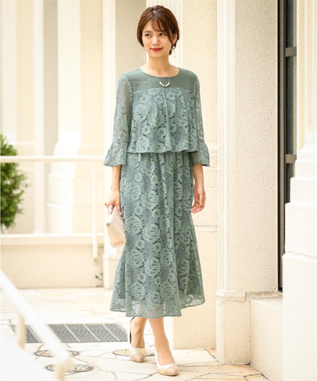 ドレス パーティー レース切替 フレア ワンピース LL/3L 大きいサイズ 結婚式 二次会 お呼ばれ セミフォーマル グレイッシュグリーン/ネイビー レディース ニッセン nissen