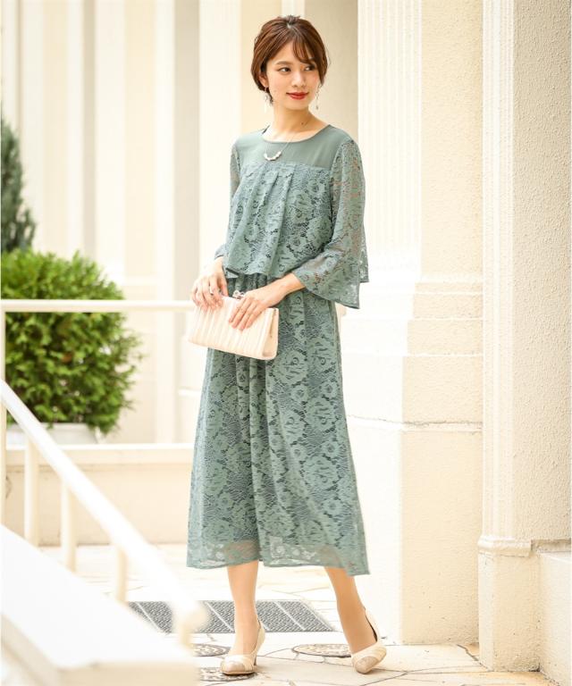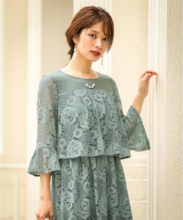 ドレス パーティー レース切替 フレア ワンピース 4L/5L/6L 大きいサイズ 結婚式 二次会 お呼ばれ セミフォーマル グレイッシュグリーン/ネイビー レディース ニッセン nissen