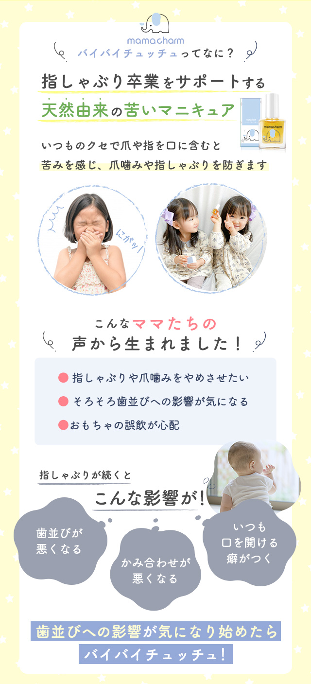 バイバイチュッチュとは:安全で苦みのあるオーガニック成分を配合した、子供の指しゃぶり防止マニキュアです。