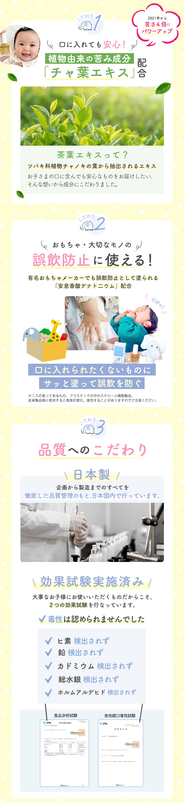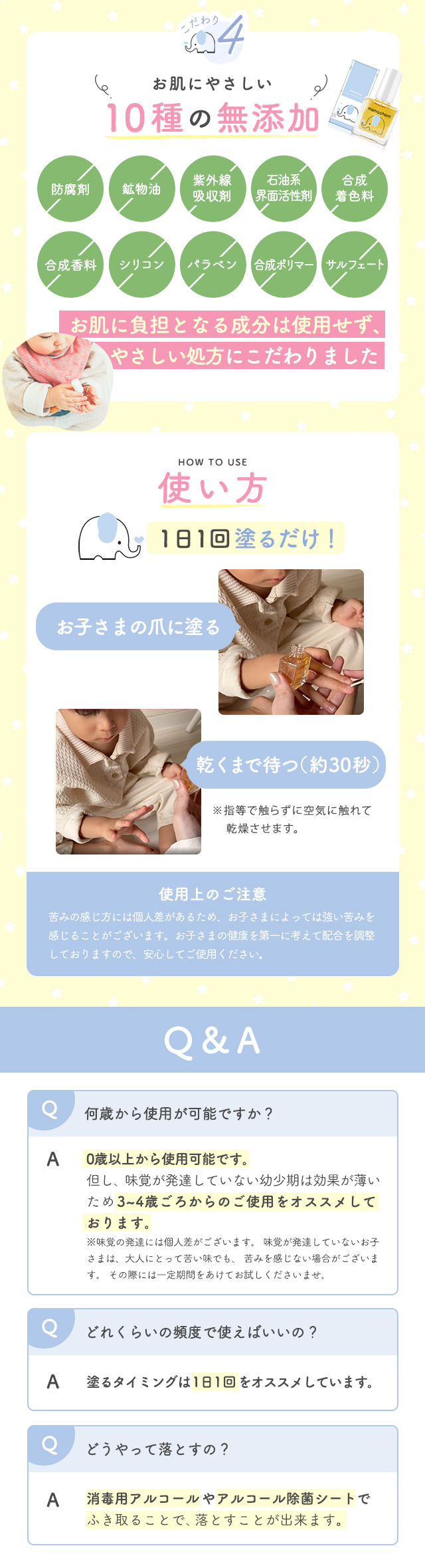 1.苦みのあるオーガニック成分で子供の指しゃぶり、爪噛みを防止。