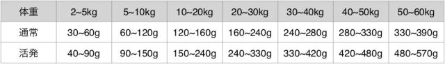 ・犬によって必要とする食事量は異なります。与え始めはこの表を参考にして、そのあと必要に応じて量を調節してください。