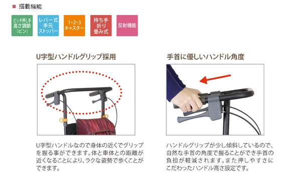 【フィーナ】はハンドルグリップが約10度傾斜しているので自然な手首の角度で握ることができるので関節に負担をかけず、押しやすいシルバーカー。「U」字型ハンドルの採用で身体の近くでグリップを握ることができ、安定歩行が可能。座面が押し手側に付いているので前にまわりこむ必要が無く、直ぐにお座り頂けます。