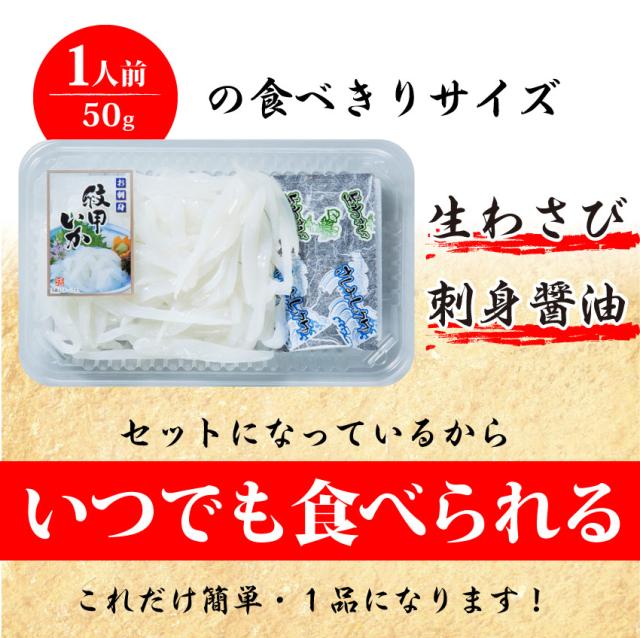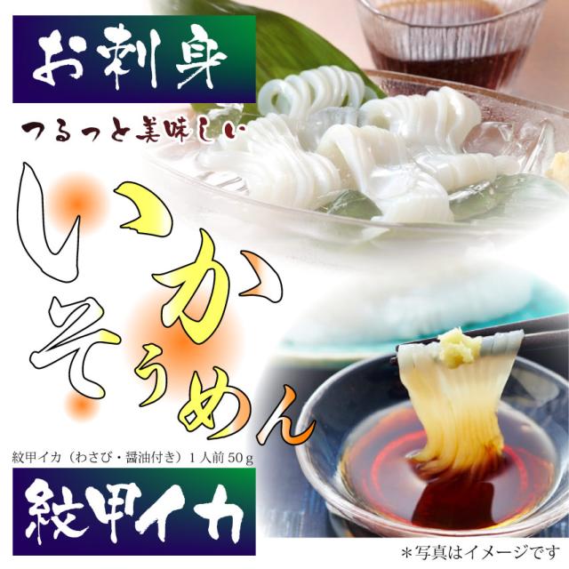 ○名称:いかそうめん○原材料名:●紋甲いか(インドネシア、ベトナム)、発酵調味料、食塩/ソルビトール、調味料(アミノ酸等)●添付しょうゆ:しょうゆ(小麦・大豆を含む)(国内製造)、水あめ、醸造酢、食塩、発酵調味料(小麦・大豆を含む)/カラメル色素、調味料(アミノ酸等)●添付わさび:本わさび(中国産)、西洋わさび、食物繊維、コーンフラワー植物油、砂糖、食塩/ph調整剤、香料、クチナシ色素、増粘多糖類○内容量:50g×4