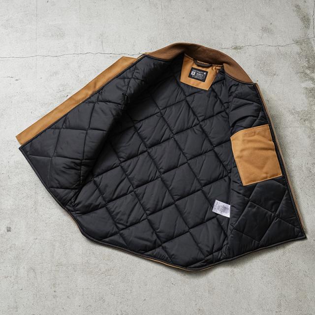 撥水性と耐風性に優れた12オンスのヘビーウェイトコットンダックを使用したダックベストが登場しました。Carharttの代名詞的な素材であるダック地に中綿が詰まったキルティングが高い保温性を確保します。 本体およびフードの内側には、保温性に優れたキルティングフランネルライニングを採用。さらに、袖部分には滑りのよいナイロンキルティングライニングを使用し、真冬の屋外でもしっかりと暖かさを確保します。防寒性と快適な着用感を兼ね備えた設計で、厳しい寒さの中での作業やアウトドアシーンでも頼れる一着です。