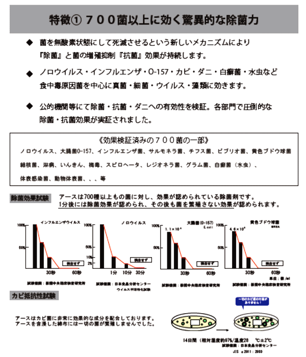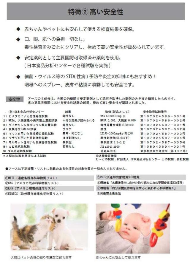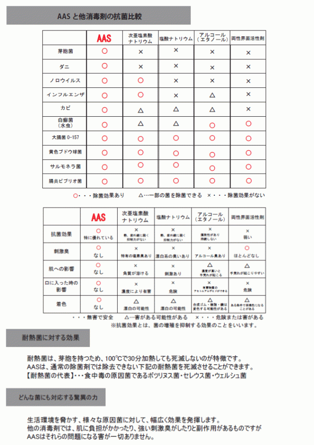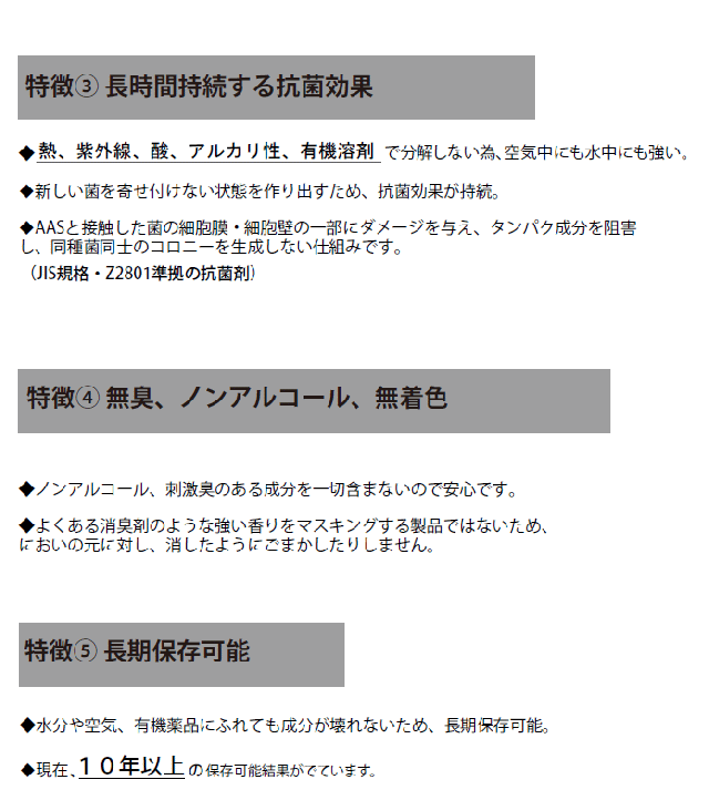 ピグアナイド系の安定薬剤を主成分にした複合物で組成されている複合材なので、他の除菌剤と異なり耐性菌の発生を長期間抑制する事ができます。