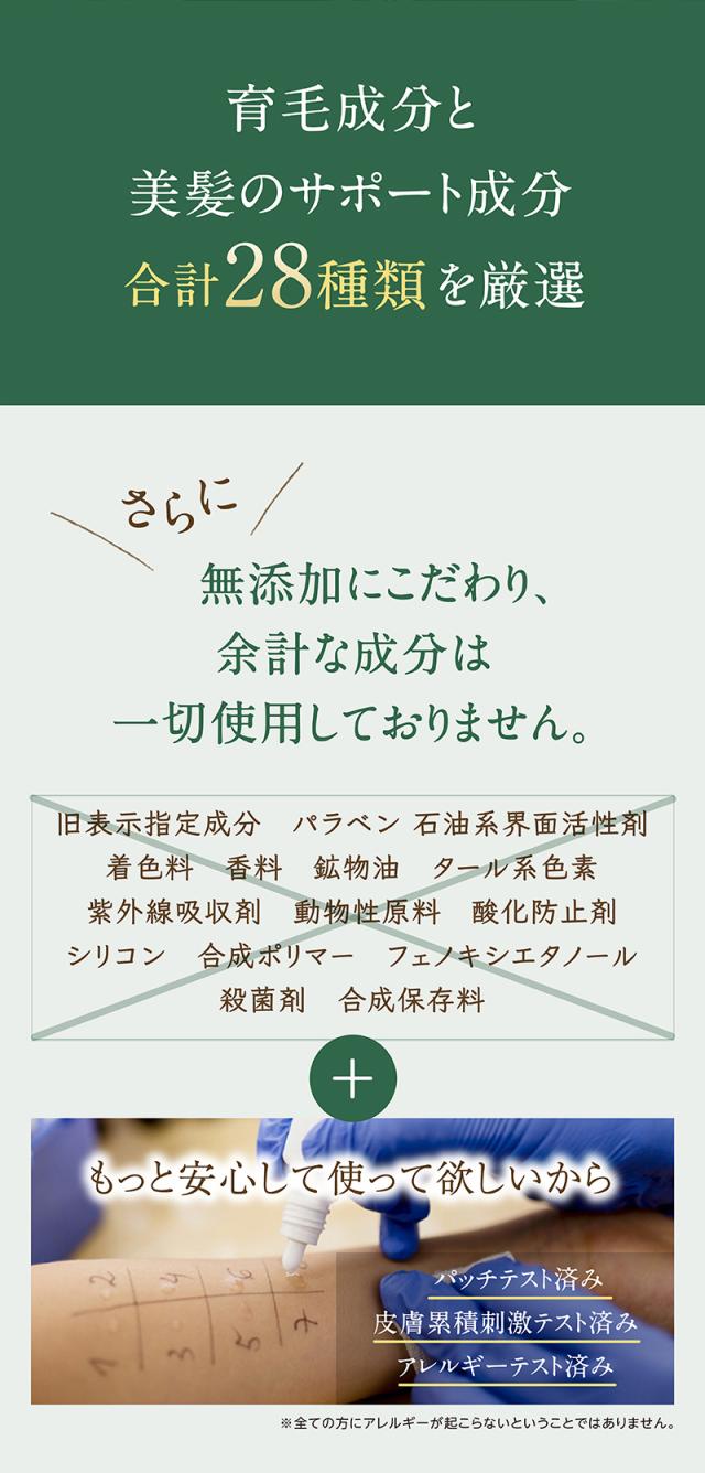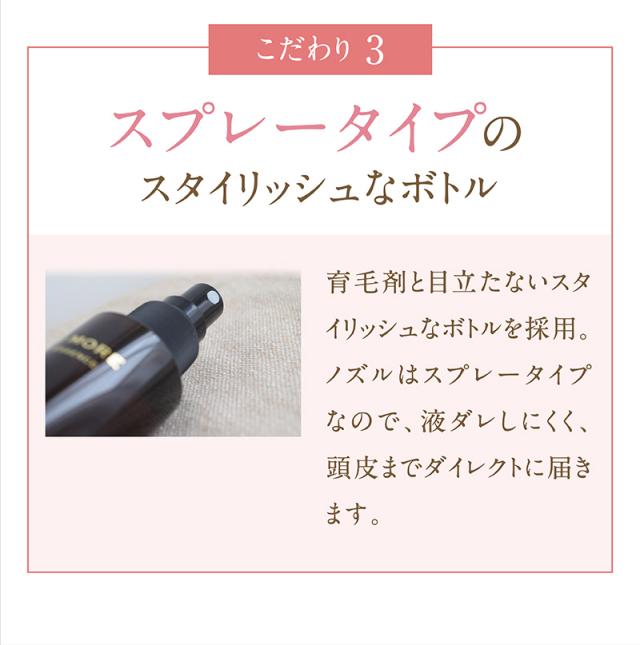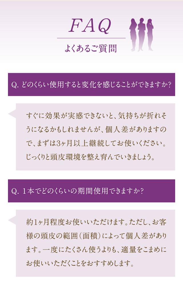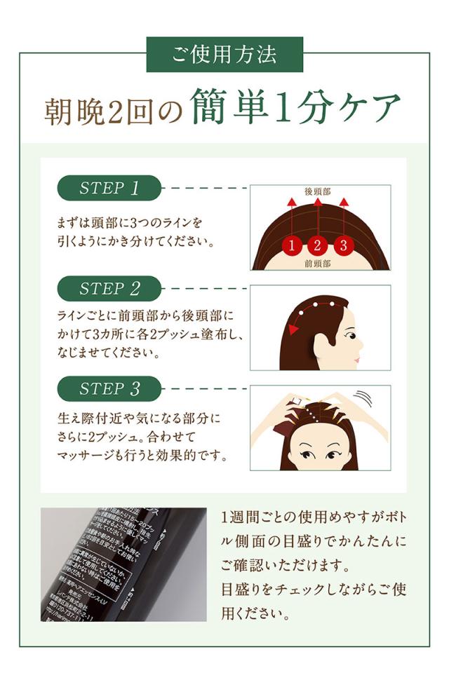 | ご使用方法 | ○適量(1回あたり15〜20プッシュ程度)を直接頭皮に噴射し、指先ですり込ませるように優しくマッサージをしてください。 ○洗髪後や朝のお手入れ時など、1日2回を目安としてお使いください。4 |