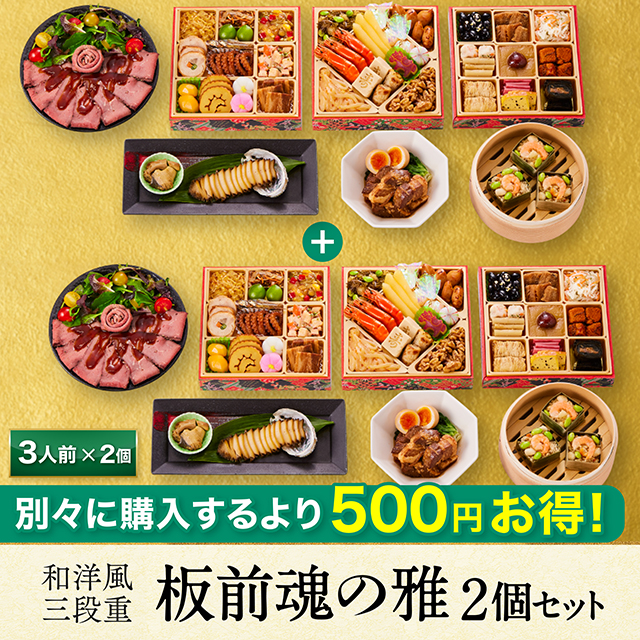 【本日限定!ポイント5倍+最大2,000円OFFクーポン】おせち 完売間近 予約 おせち料理 板前魂の雅 2個セット 和洋風三段重 ローストビーフ 福良鮑 鮑 あわび 豚角煮 海鮮おこわ 付き 3人前 40品目 人気 正月 冷凍 食品 2025 2026 送料無料