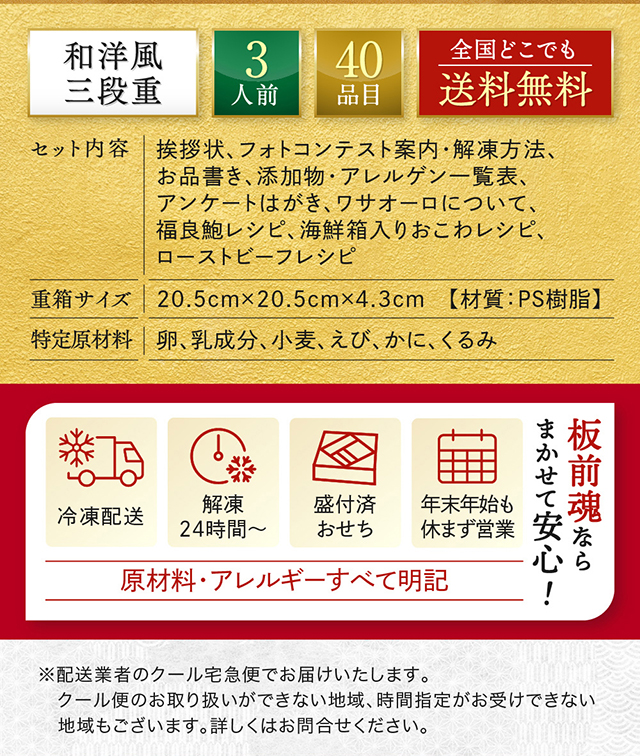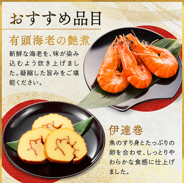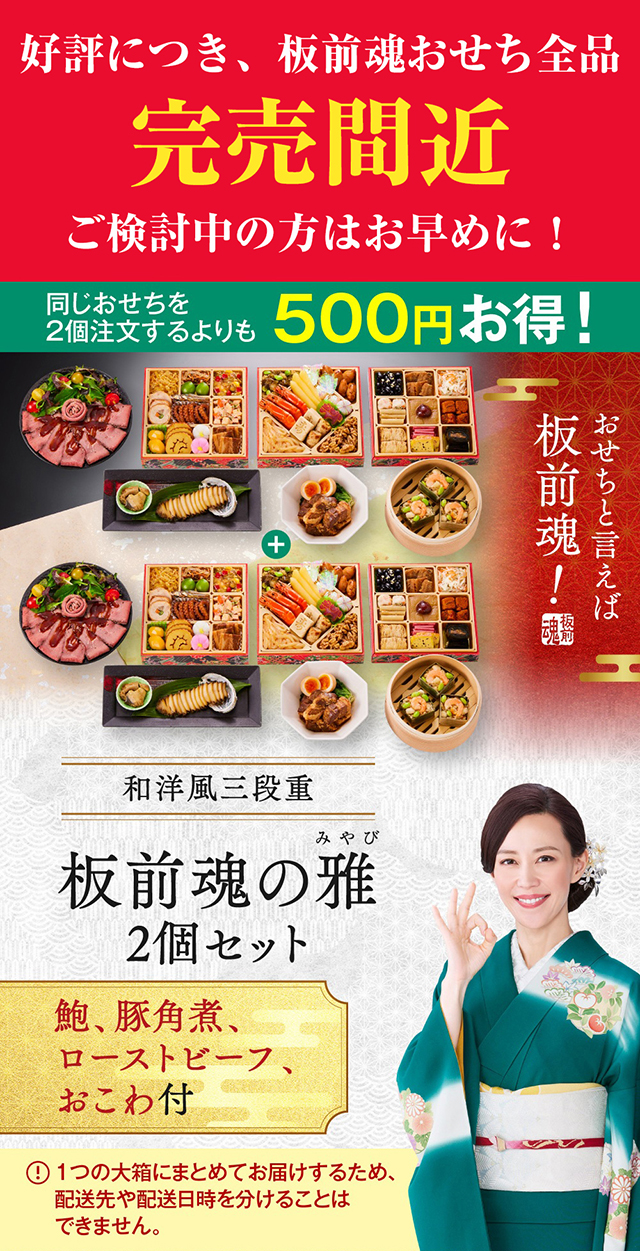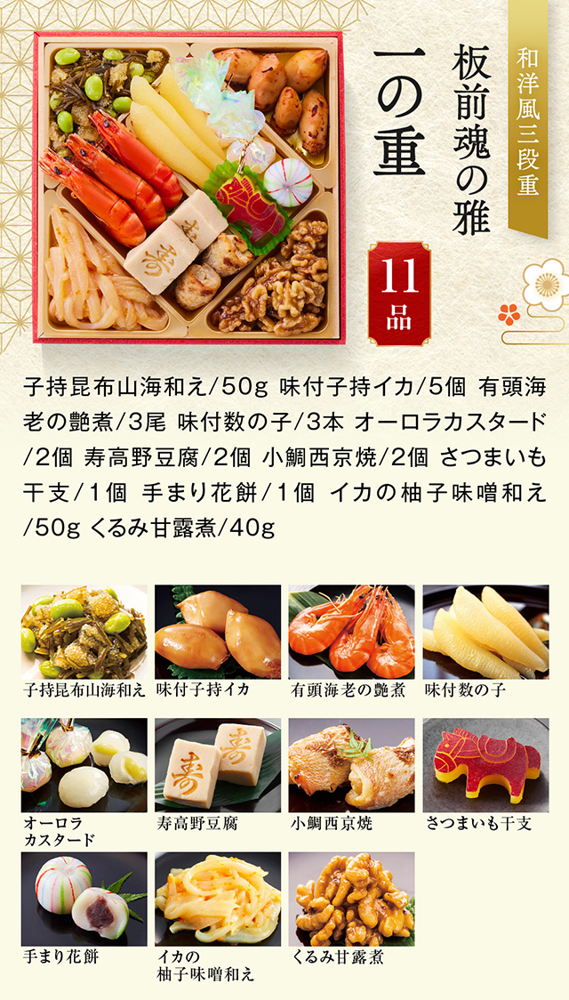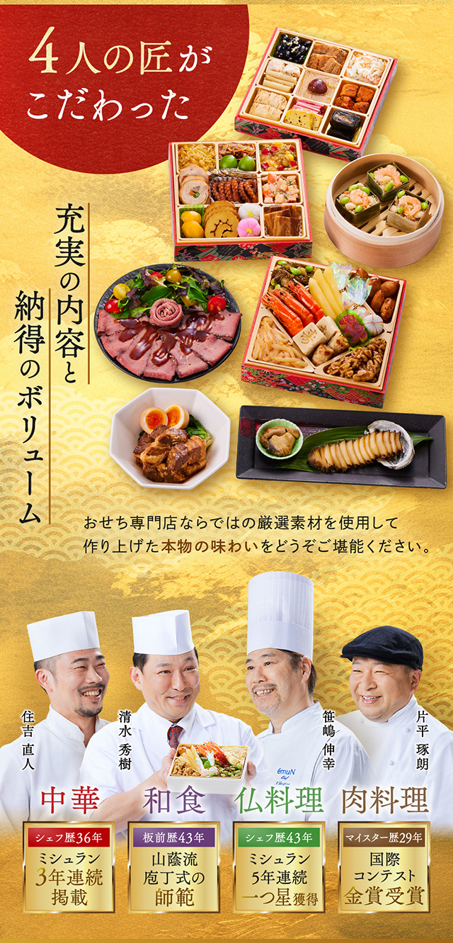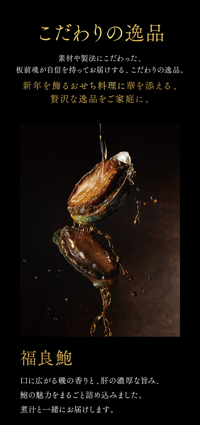 板前魂のおせち料理は、函館、小樽 、仙台、 築地 、山梨、金沢、浜松、 京都 、下関、 博多 、鹿児島など日本や海外の産地をまわり厳選した食材を使用し、有名店やホテルで修行したシェフや繁盛店を営む板長といった4人の匠が監修しています。