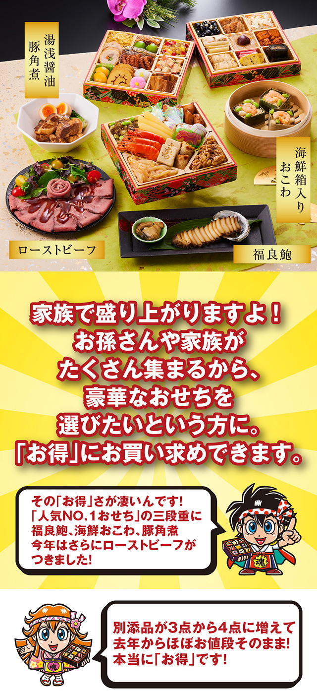 少人数から大人数まで、大人も子どもも皆様で味わい楽しめる、家族や口コミで人気のおせちを一段重〜七段重まで60種類以上取り揃えました。ご予約受付中。
