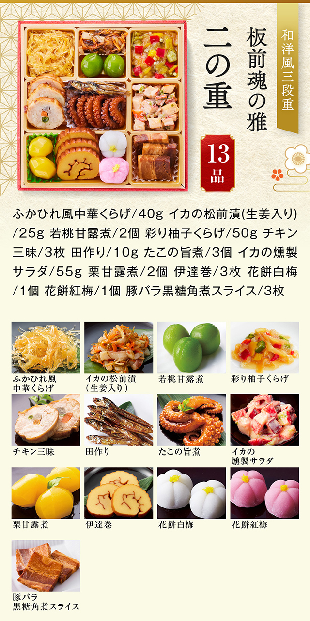 【二の重】ふかひれ風中華くらげ/イカの松前漬(生姜入り)/若桃甘露煮/彩り柚子くらげ/チキン三昧/田作り/たこの旨煮/イカの燻製サラダ/栗甘露煮/伊達巻/花餅白梅/花餅紅梅/豚バラ黒糖角煮スライス