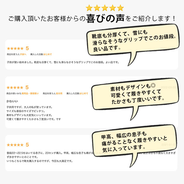- サイズ違いで二足目購入です。子ども用ですが足幅が小さいためピッタリです。あまり滑らなくて大満足。次回も在庫有る限り購入予定です。ありがとうございました。