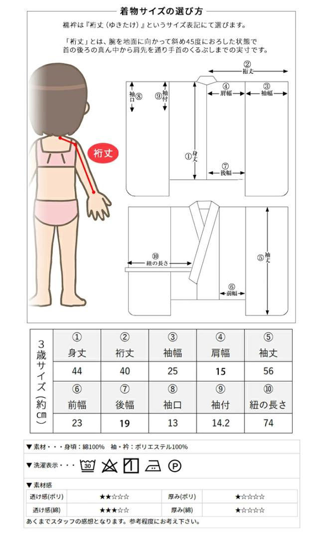 3歳:身丈/裄丈/袖幅/肩幅/袖丈/前幅/後幅/袖口/袖付/紐の長さ