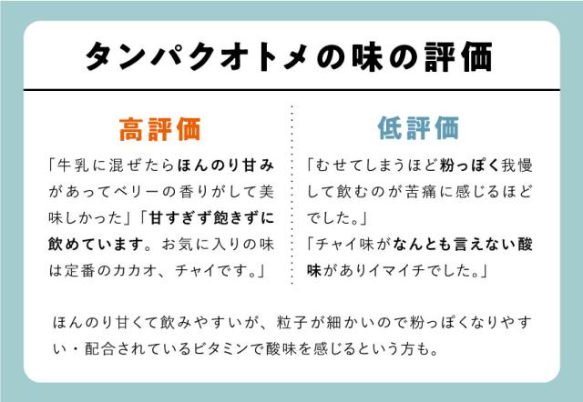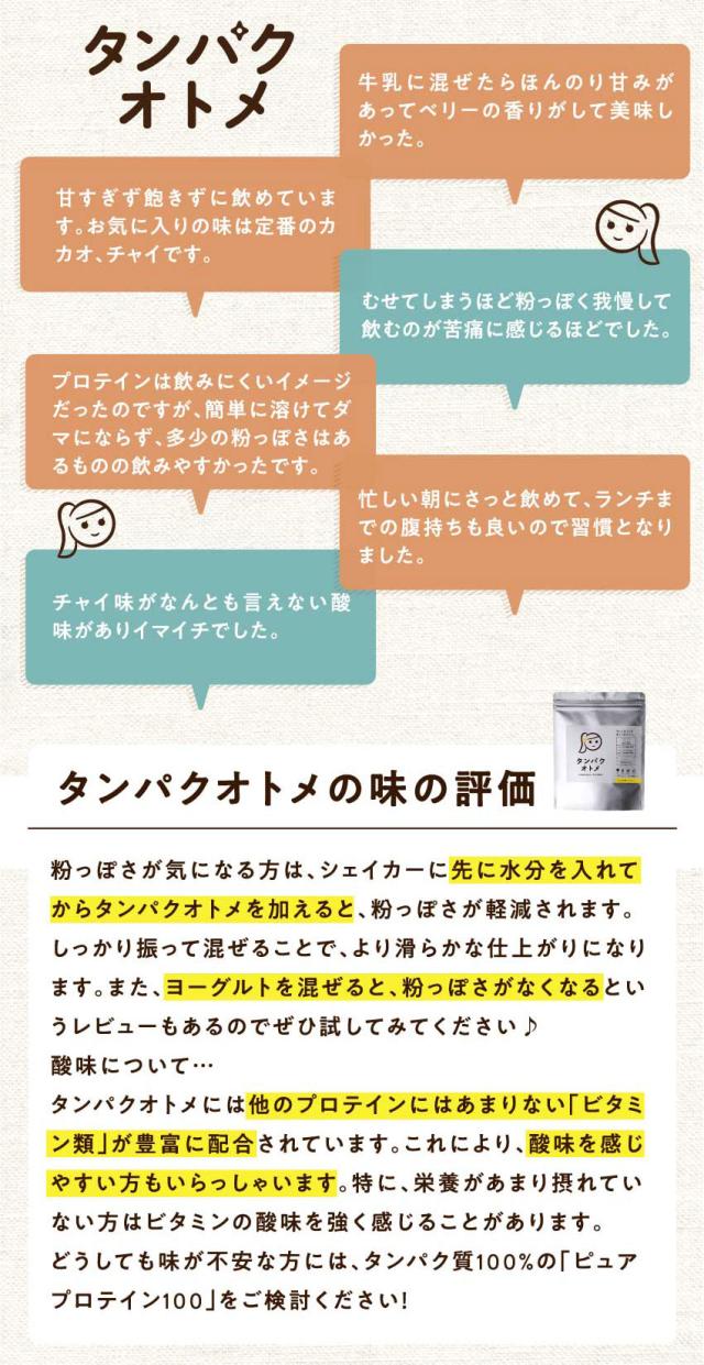 粉っぽさが気になるという方で、もしコップやシェイカーに先にタンパクオトメを入れてから水分を入れている方は、順序を逆にしてみてください。シェイカーでしっかり振って混ぜると粉っぽさはかなり軽減されます。また、ヨーグルトを混ぜると粉っぽさがなくなったというレビューもありました! そして、酸味に関してですが、タンパクオトメには他のプロテインにはあまりない「ビタミン類」を豊富に配合しています。栄養があまり摂れていない方はビタミンの酸味を感じやすいようです。 どうしても味が不安な方はタンパク質100%の「ピュアプロテイン100」をご検討ください!