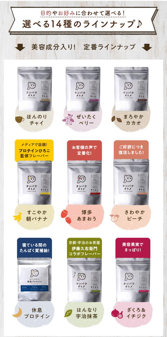 タンパクオトメ(チャイ/ベリー/カカオ/宇治抹茶/ざくろ&イチジク - 260g・ピュアプロテイン100 - 360g) ジッパー式袋タイプ 2,980円