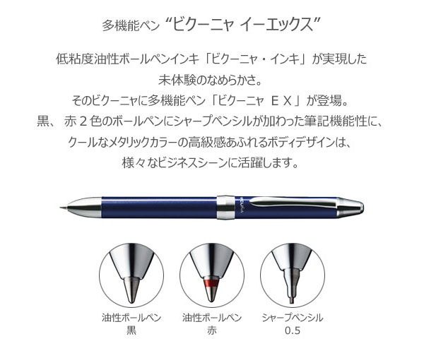 特長:低粘度油性ボールペンインキを搭載したビクーニャに、多機能ペン「ビクーニャ EX」が登場。