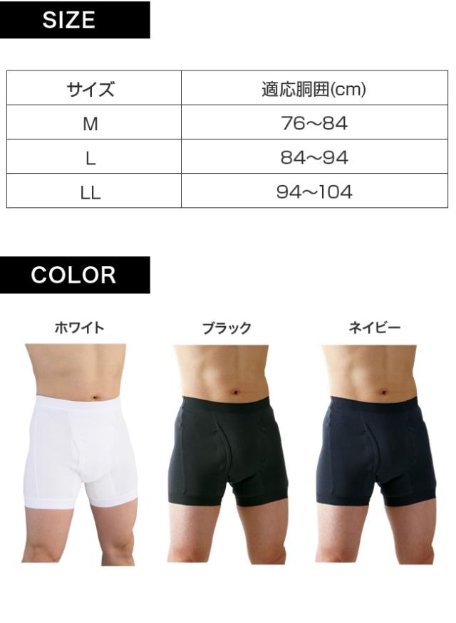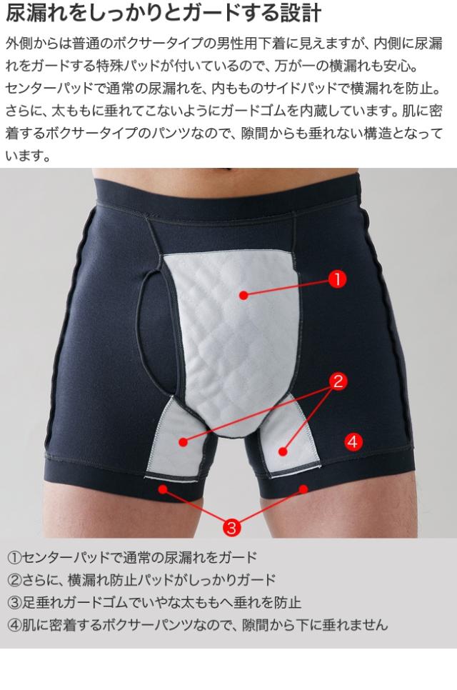 外側からは普通のボクサータイプの男性用下着に見えますが、内側に尿漏れをガードする特殊パッドが付いているので、万が一の横漏れも安心。