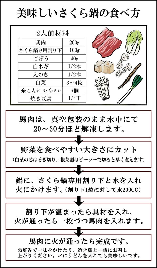 | 解凍方法 お召し上がり方 | <解凍方法> 真空包装のまま水中にて20〜30分ほど解凍して下さい。 <調理例・お召し上がり方> 【材料:2人前】 馬肉200g、さくら鍋専用割り下1袋(100g)、ごぼう40g、 白ネギ1/2本、 えのき1/2本、白菜 3〜4枚、糸こんにゃく(結び)6個、 焼き豆腐1/4丁 1.馬肉は、真空包装のまま水中にて20〜30分ほど解凍します。 ※きちんと解凍することでお肉が一枚ずつはがれやすくなります。 ※電子レンジや、自然解凍は味や風味を損なう原因となります。必ず水中にて解凍してください。 2.野菜を食べやすい大きさに切ります。 (白菜の芯はそぎ切り、根菜類はピーラーで切ると早く煮えます) 3.鍋に、さくら鍋専用割り下と水を入れ火にかけます。(割り下1袋に対して水200cc) 4.割り下が温まったら具材を入れ、火が通ったら一枚ずつ馬肉を入れます。 5.馬肉に火が通ったら完成です。お好みで一味をかけたり、溶き卵と一緒にお召し上がりください。〆にうどんを入れても美味しいです。※馬肉は火を通し過ぎると硬くなります。色が変わった瞬間が食べごろです。 | |