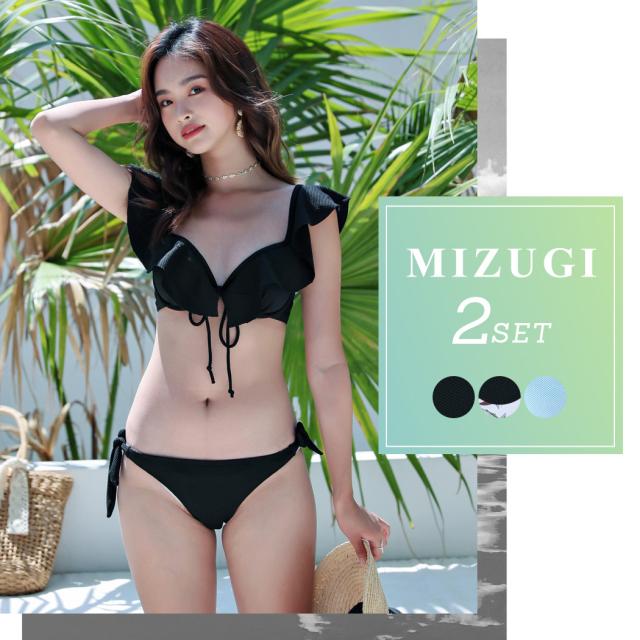 即納 水着 ビキニ レディース セクシー サイドリボンショーツ 2点セット バックフリル お洒落 可愛い 水着 セクシー マイクロビキニ シンプル 無地 花柄 オトナ女子 ワイヤー入り パッド付き バスト 盛れる 夏 海 プール ビーチ 旅行 リゾート ブラック黒 フラワー