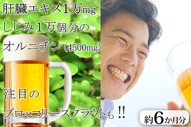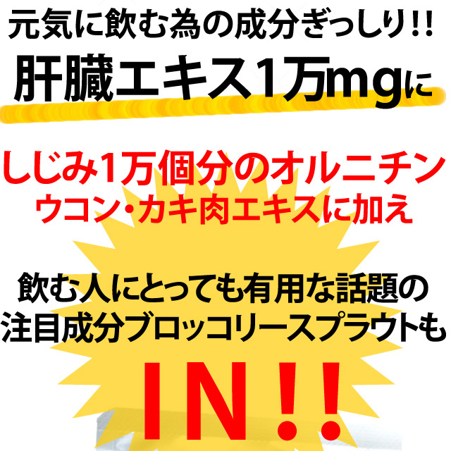 【 原材料 】 肝臓エキス末、L-オルニチン塩酸塩、ウコンエキス、しじみ濃縮末、カキ肉エキス、ブロッコリースプラウトパウダー(ブロッコリースプラウト、水溶性食物繊維)、結晶セルロース、ステアリン酸カルシウム、二酸化ケイ素