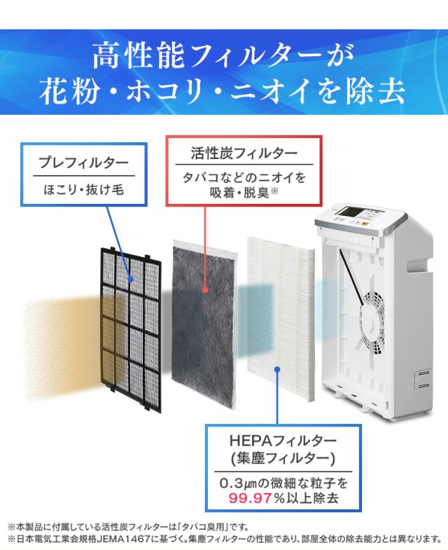 集塵フィルター(HEPAフィルター)・活性炭フィルター・プレフィルターが高い空気洗浄力を発揮し、花粉・ほこり・においを除去します。