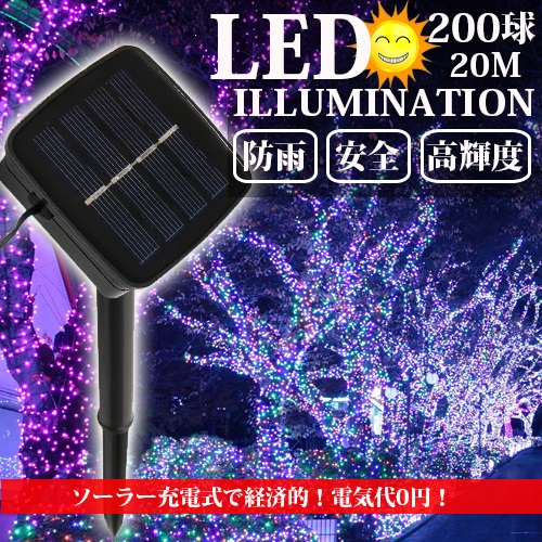 LEDイルミネーション ソーラー充電式 8パターン 200球 20m コントローラー付き 自動ON/OFF クリスマス 屋外 防雨 クリスマスツリー