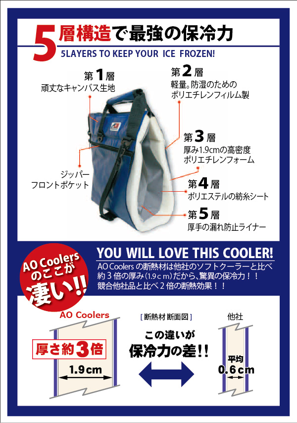 | 特徴 | AOクーラーが選ばれるポイント 1-最強の保冷力 2-軽量 3-結露しない構造 4-汚れても簡単に掃除できるライナー 5-縫い目のないインナー構造 6-環境に優しい新TPUライナー | ||||||