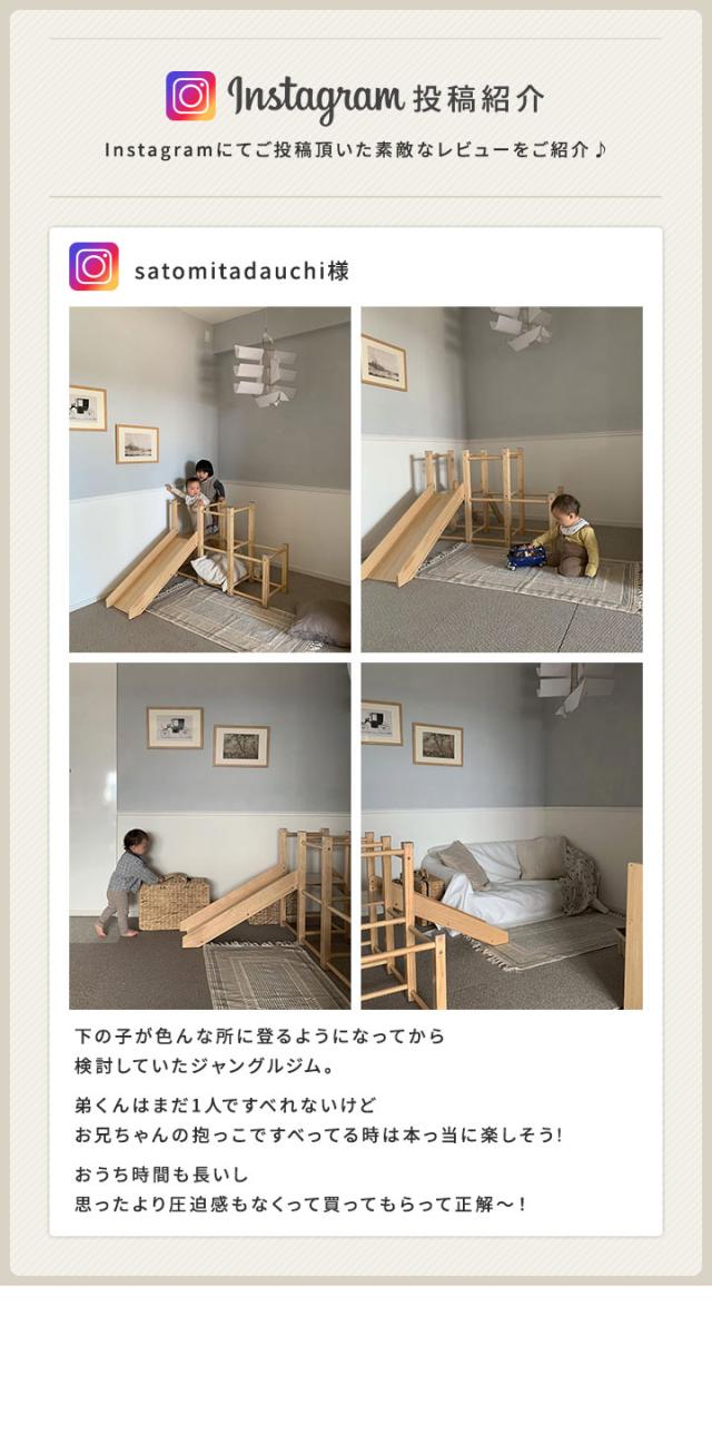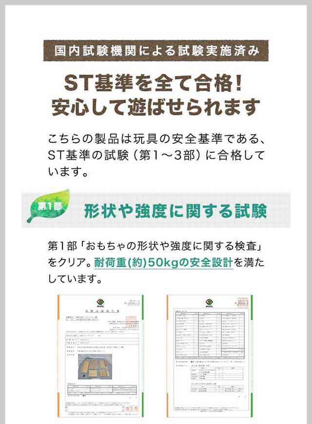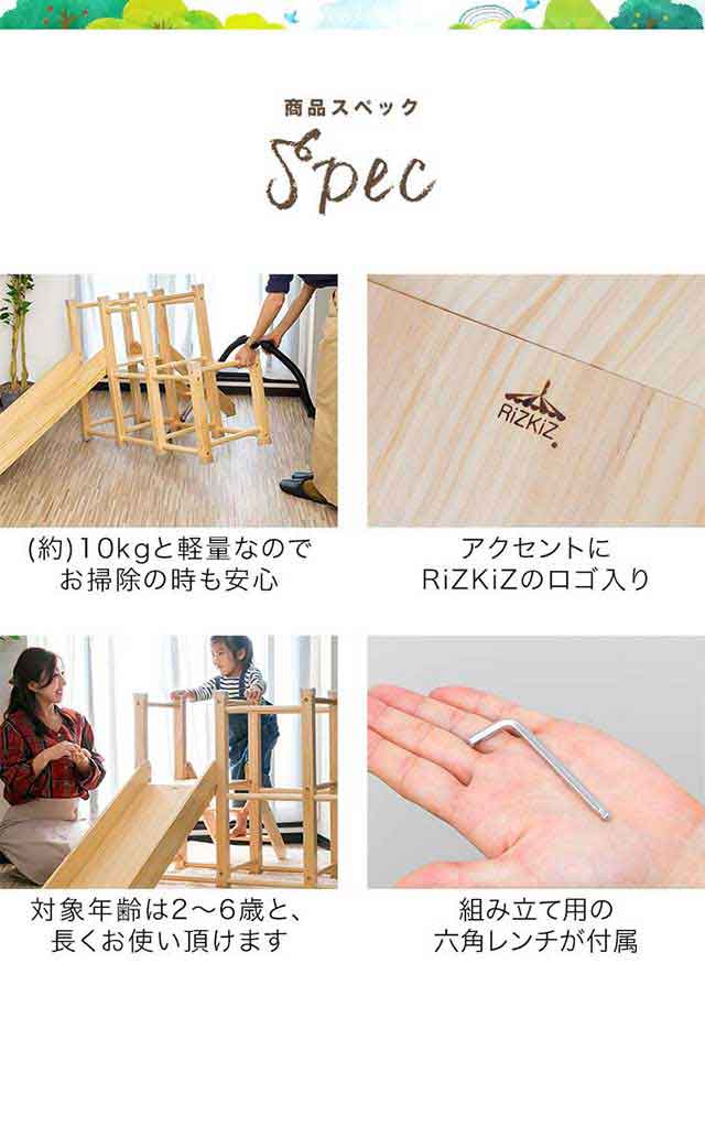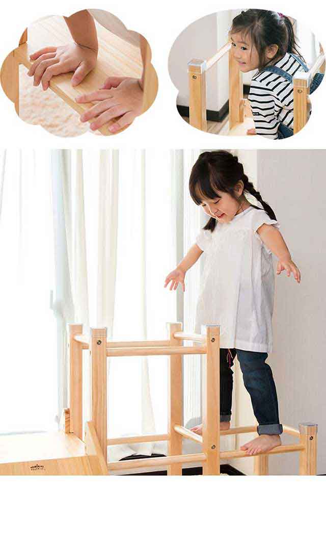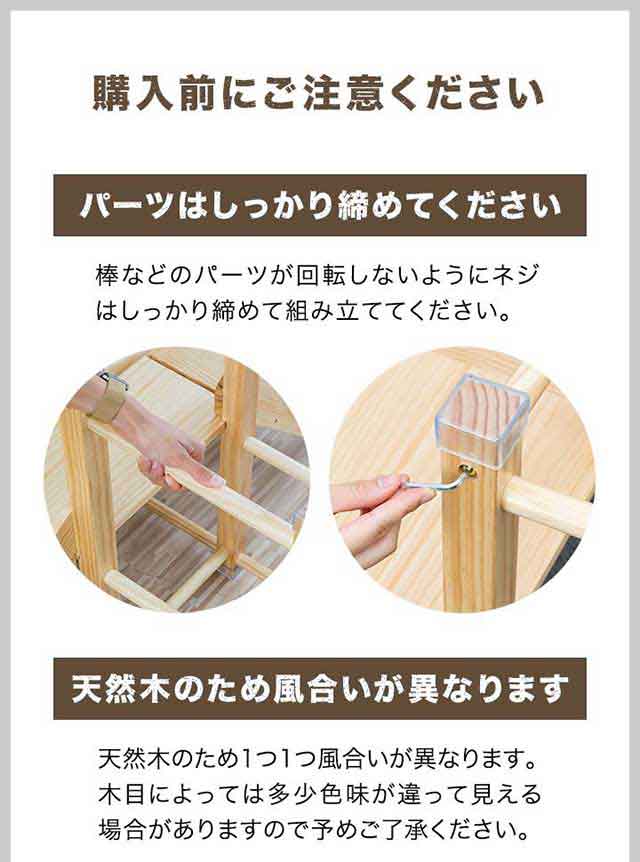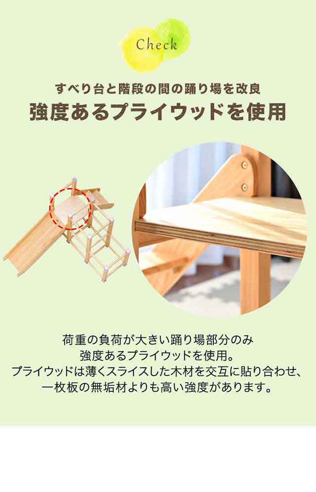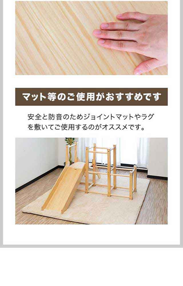 | 特記事項: ※絨毯の上など不安定な場所に置かないでください。転倒してケガや破損の原因になります。 ※本製品は室内専用です。屋外で使用しないでください。破損の原因になります。 ※火のそばに近づけて設置しないでください。火災の原因になります。 ※本体を水につけたり、水のかかる場所で使用しないでください。カビ・変色・変形の原因になります。 ※お手入れに塩素系・酸性タイプ等の洗剤は絶対に使用しないでください。カビ・変色したり、有毒ガスの発生により健康を害す事があります。 ※3人以上で同時に乗らないでください。 ※お子様がご使用の際は、けがをしたり、事故が起きないよう、必ず保護者の方が付き添い、目を離さないようご注意ください。 ※ご使用前、ご使用後は必ず点検を行ってください。万が一破損や異常があった場合は使用を控えてください。 ※荷重の負荷が大きい踊り場部分のみ、強度の有るプライウッドを使用しています。プライウッドは薄くスライスした木材を交互に貼り合わせているので、一枚板の無垢材よりも高い強度があります。 |