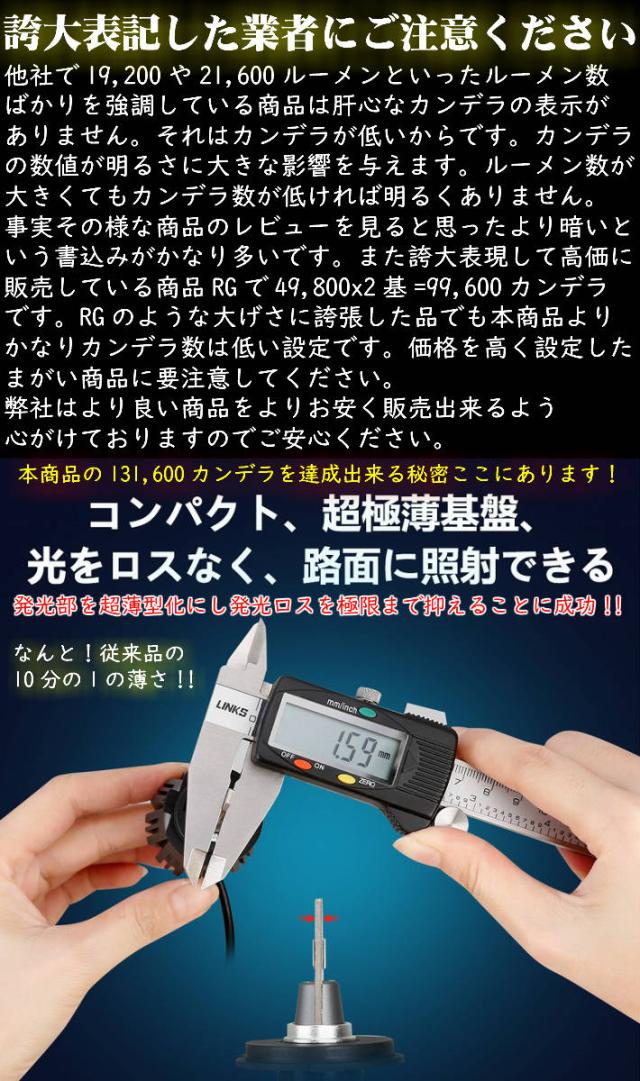 また誇大表現して高価に販売している商品RG製で49,800x2基=99,600カンデラです。RG製のような大げさに誇張した品でも本商品よりかなりカンデラ数は低い設定です。適正価格より高く設定した商品に要注意してください。
