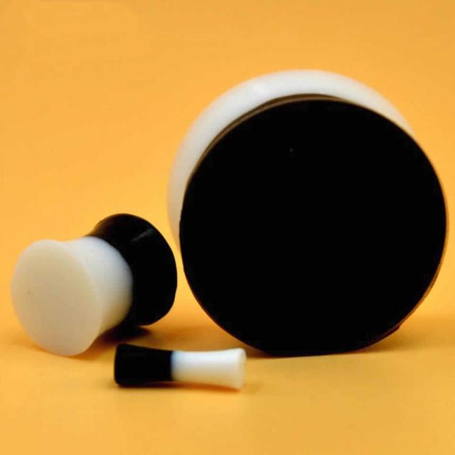 白色と黒色のシリコンパーツをくっつけた両側が広がったダブルフレアアイレット型のボディピアス。
