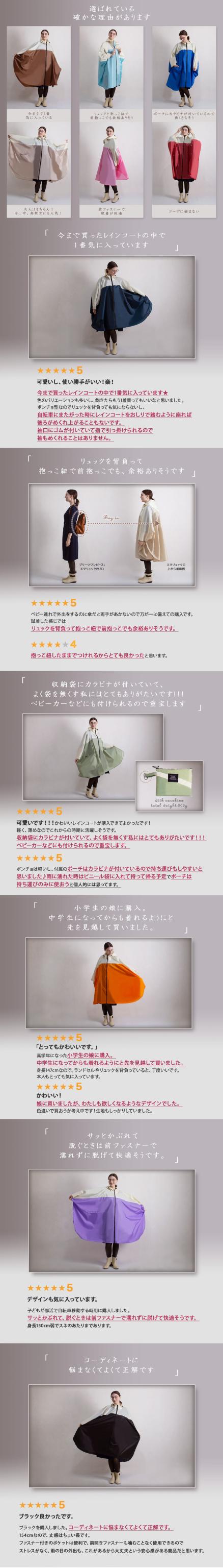 - デザインと色はとても可愛い。使用後専用のポーチがあるのですがピッタリサイズなのでピッタリに畳むのがめんどくさい。出勤後レインコート入れる時間と場所がないので少し大変