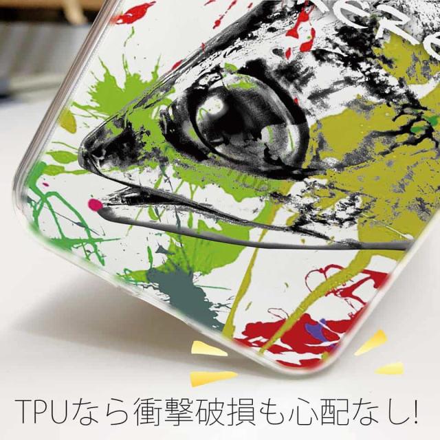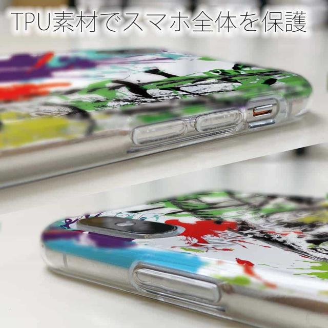 | ケースの素材について | 側面はゴムのように柔らかいTPU素材で、スマホ本体を守ります。万が一の落下でもケースが割れることがなく、耐久性の高いケースとなります。クリア(透明)のTPUケースにプリントしていますので、スマホ本体のカラーを活かしながらデザインケースが楽しめます。 |