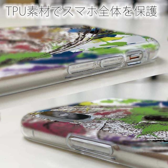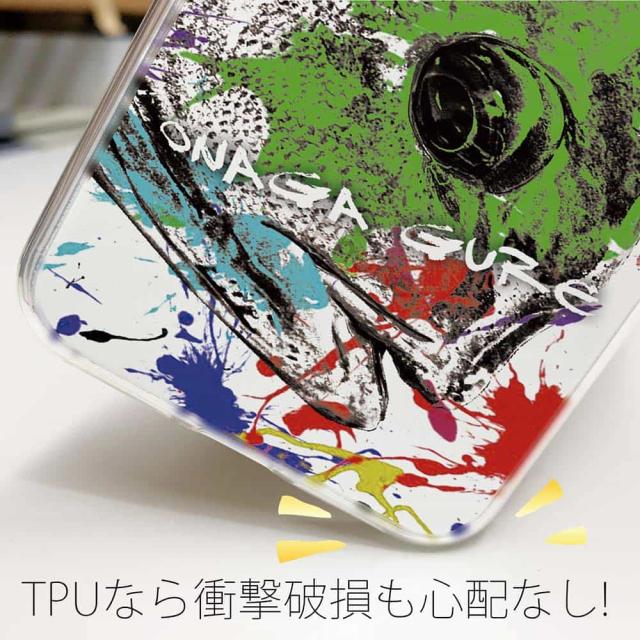 | ケースの素材について | 側面はゴムのように柔らかいTPU素材で、スマホ本体を守ります。万が一の落下でもケースが割れることがなく、耐久性の高いケースとなります。クリア(透明)のTPUケースにプリントしていますので、スマホ本体のカラーを活かしながらデザインケースが楽しめます。 |