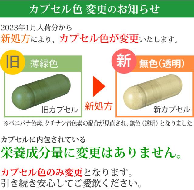 - ユーグレナグラシリス(国内製造)、ゼラチン、澱粉、デキストリン、植物発酵エキス(糖蜜、黒砂糖、ヨモギ、ウコン、その他)、α-リポ酸、コエンザイムQ10、穀物麹(大麦、あわ、ひえ、きび、たかきび、紫黒米、米粉)、乳糖、有胞子性乳酸菌/ステアリン酸カルシウム、微粒二酸化ケイ素、ベニバナ色素、クチナシ色素(一部にリンゴ・大豆・キウイフルーツ・バナナ・モモを含む)
