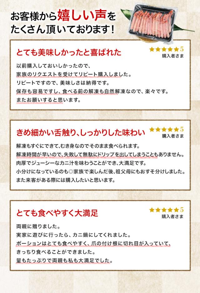 - 数の子松前漬け数の子が大きく沢山入っているのでお気に入りでリピしていましたが、今回初めてカニを頼み、貴店の信頼がさらに増しました。蟹しゃぶにしましたが、旨味がしっかりあり、とても美味しくいただきました...