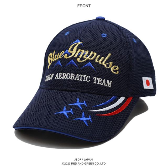 正面に6機編成のブルーインパルスの機体と筆記体の金のロゴマーク、バイザーに3機編成の機体とカラースモーク、サイドに日章旗の刺繍入り。