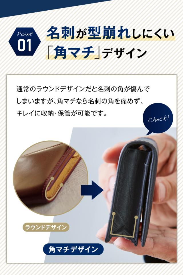 通常のラウンドデザインだと名刺の角が傷んでしまいますが、角マチなら名刺の角を傷めず、キレイに収納・保管が可能です。