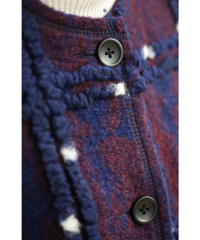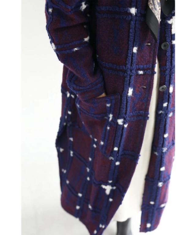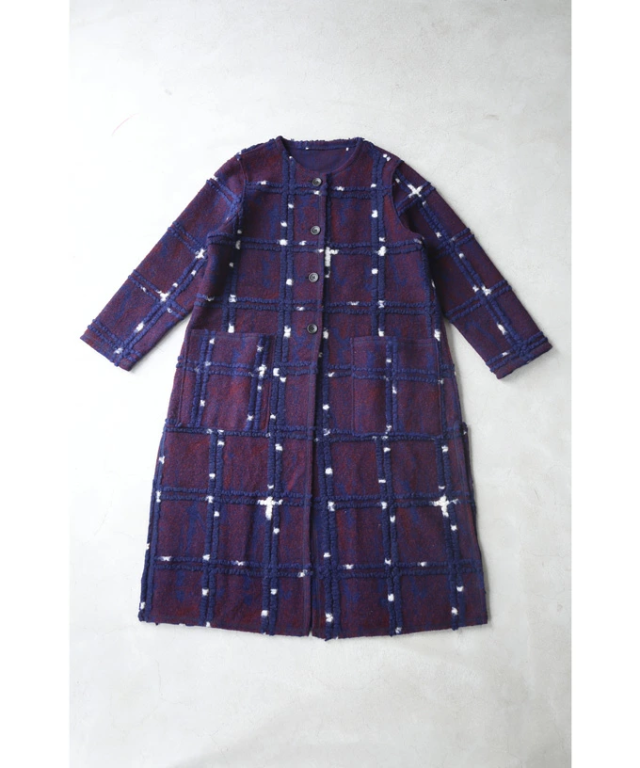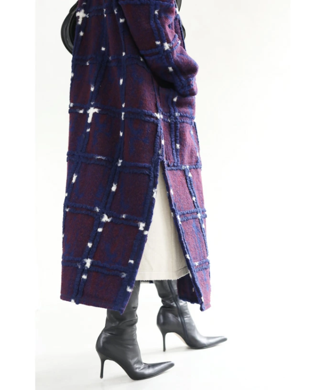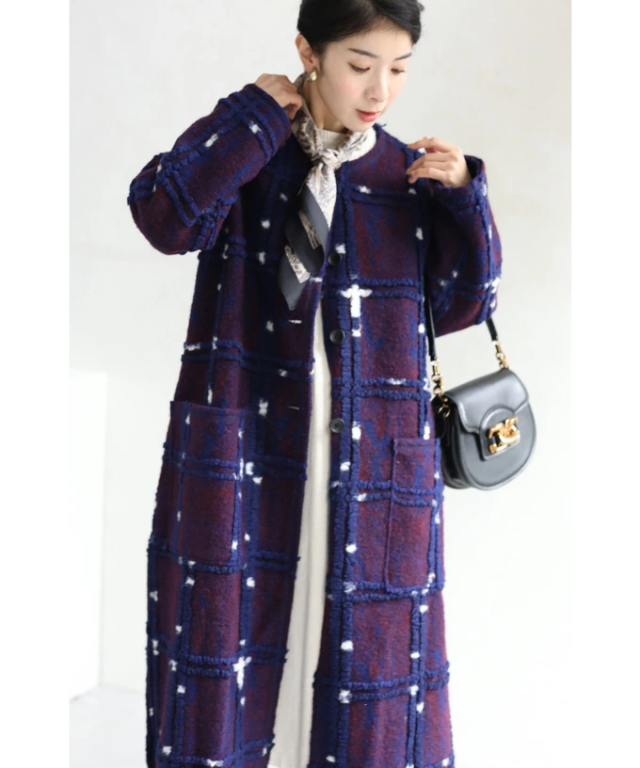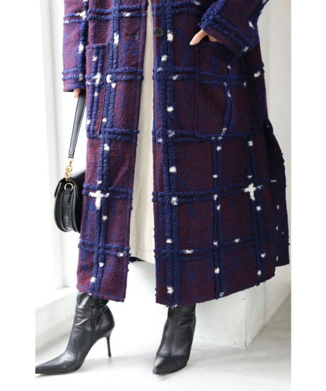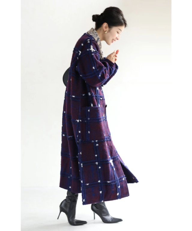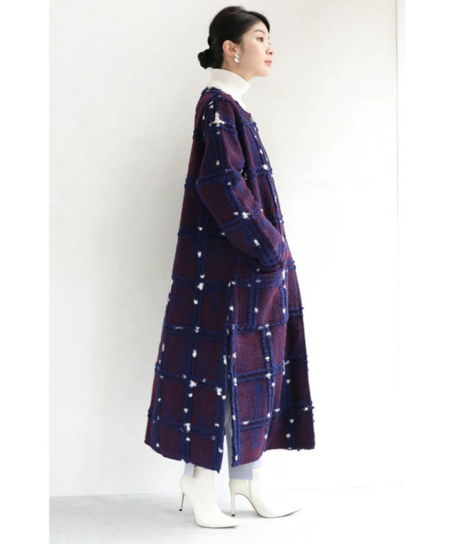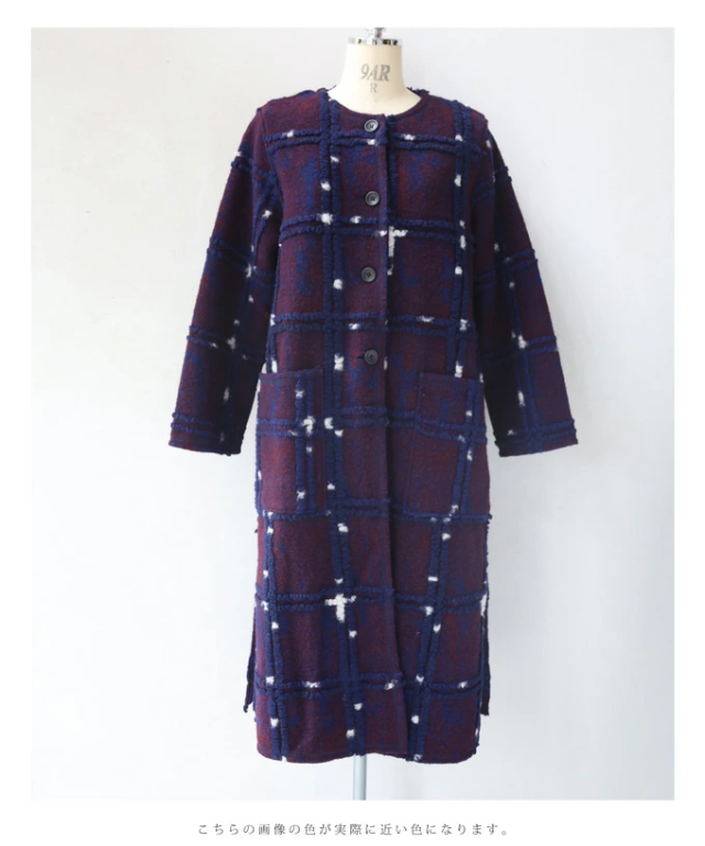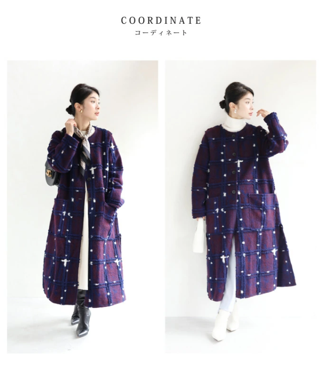 再入荷11月18日 浮かぶチェック模様の淡雪ロングコート M〜L w6-70640 cawaii ロングコート レディース 冬 厚手 アウター 暖かい ノーカラーコート 前ボタン 秋冬 オケージョン お呼ばれ 通勤 オフィス 起毛 フリース 秋ママ ミセス 50代 60代 40代