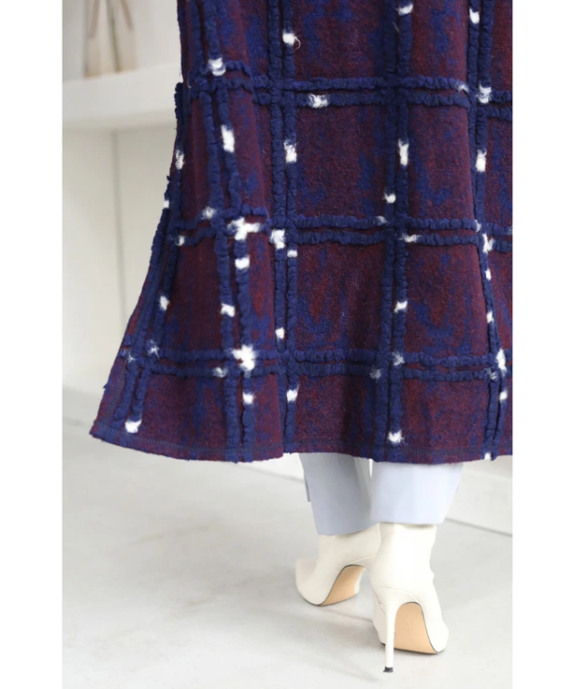 立体に編まれたチェック柄が、上品な可愛らしさがあります。深みのある紫色が、大人の女性を引立ててくれます。
