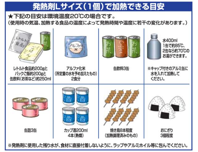 | 内容量 | 1セット(2回分) セット内容:発熱剤L(2個)、加熱袋(1枚) |